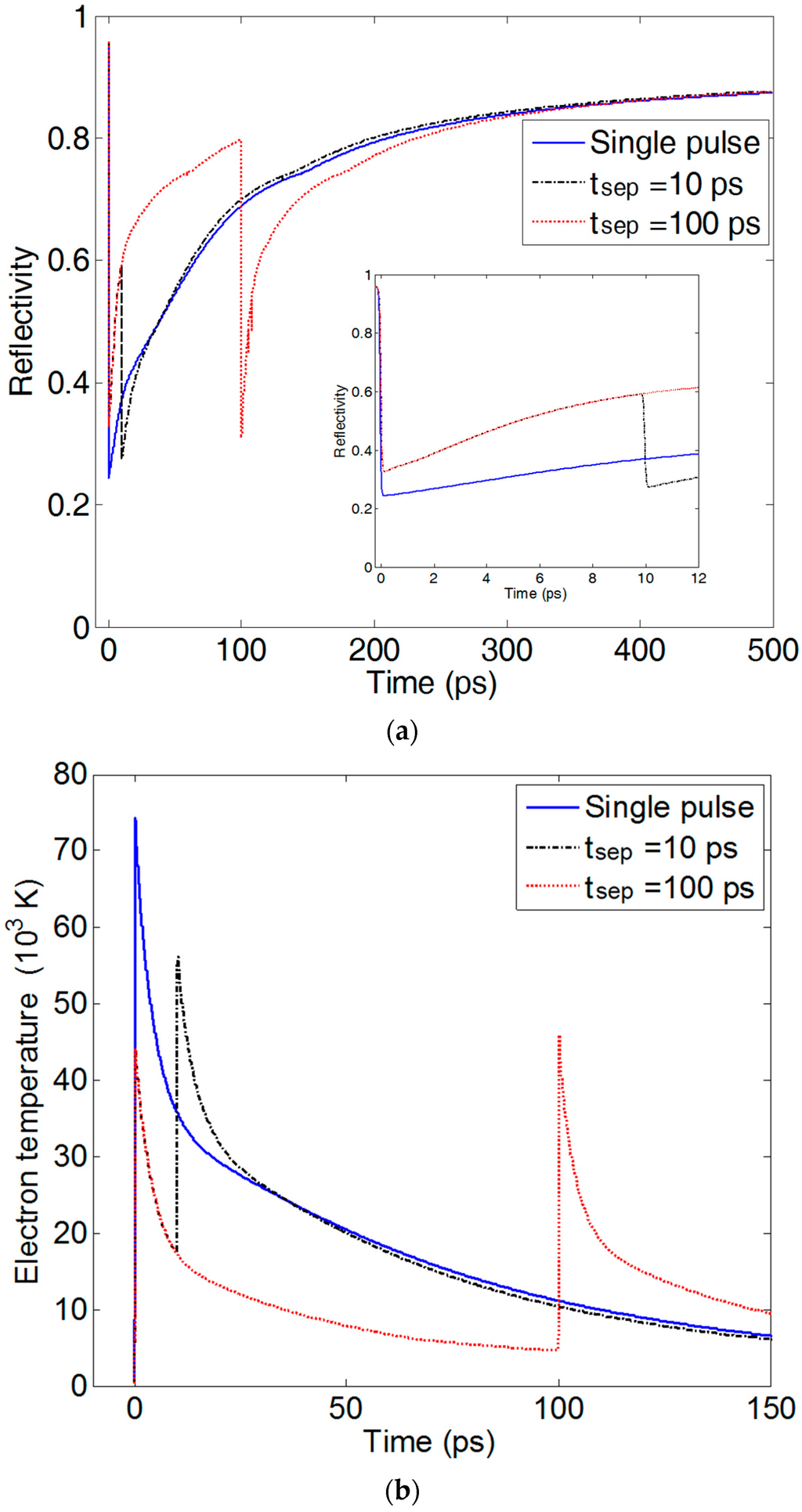 For the dual-pulse cases, the minimum reflectivity after the second pulse irradiation is usually lower than that of the first pulse. For example, in the case of tsep = 10 ps (see inset), the minimum reflectivity for the first and second pulses are 0.327 and 0.274, respectively, since the high electron temperatures (see Figure 2b) excited on the copper surface after the first pulse help decrease the reflectivity for the second pulse. It was evident that these dynamic properties could alter the thermal response.