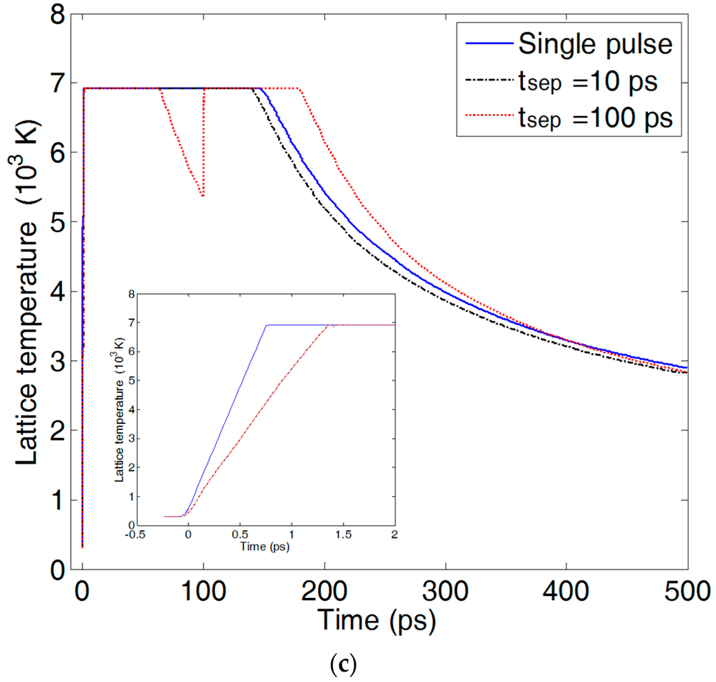 Figure 2b shows that the highest electron temperature decreases with increases in separation time; the maximum values for the three cases are 74,229 K (t = 0.12 ps), 56,029 K (t = 10.1 ps) and 45,967 K (t = 100.1 ps), respectively. In the dual-pulse cases, however, the peak electron temperature induced by the second pulse irradiation is usually higher than that by the first pulse. For example, in the case of tsep = 100 ps, the peak electron temperatures induced by the first and second pulses are 44,121 K and 45,967 K, respectively. It is worth noting that the surface reflectivity before the second pulse irradiation is lower than that at room temperature (Figure 2a) due to temperature rise in material. The further decrease of the reflectivity by the second pulse increases the amount of laser energy deposited from the second pulse, and thus the electron temperature is increased to a higher level than that by the first pulse.
