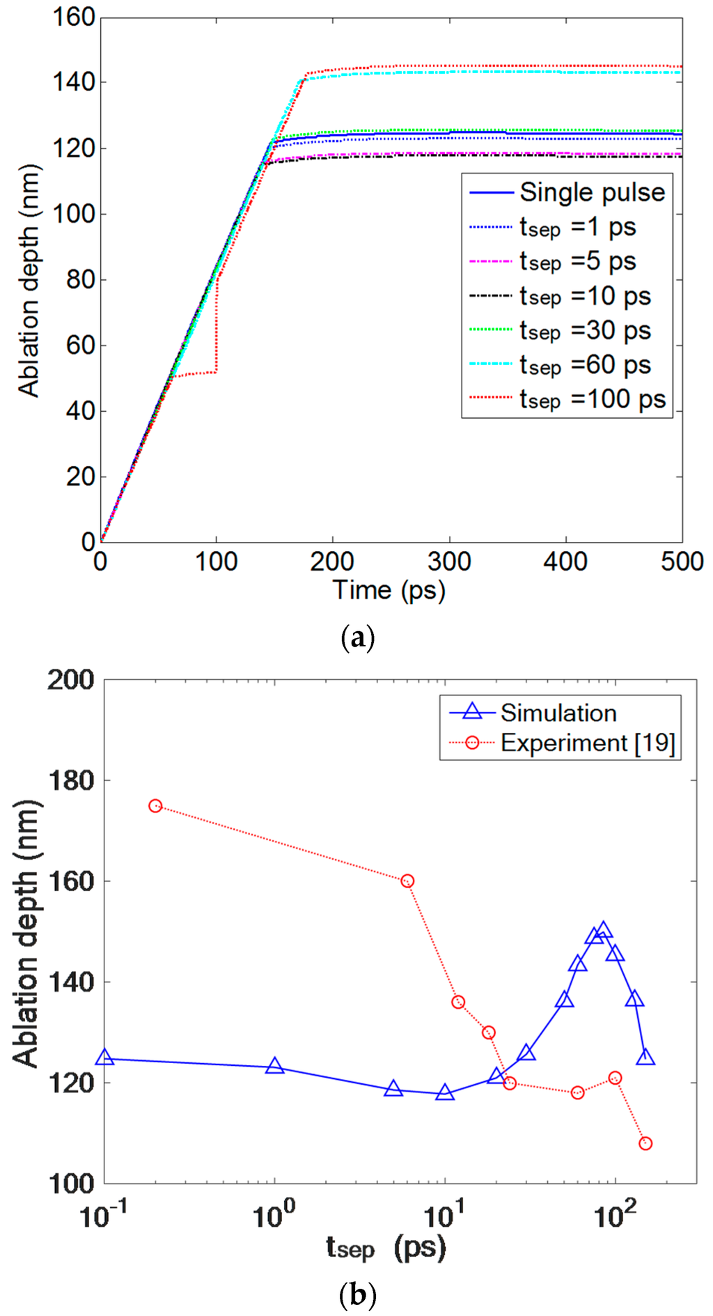 However, the simulation ablation depths are not agreed well with those by experimental result. The simulation result for the dual pulse with tsep < 10 ps is similar to the experimental results by [,]; e.g., the ablation depth is similar to that by the single pulse for tsep < 1 ps and smaller for 1ps < tsep < 10 ps. However, for tsep > 10 ps, the experimental result show that the ablation depth decreases with tsep in the range of 10–150 ps. The reason is that when tsep > 10 ps, the plasma starts to shield the target surface and the second laser pulse is spent reheating the plasma, with no additional ablation depth resulting from the second pulse observed.