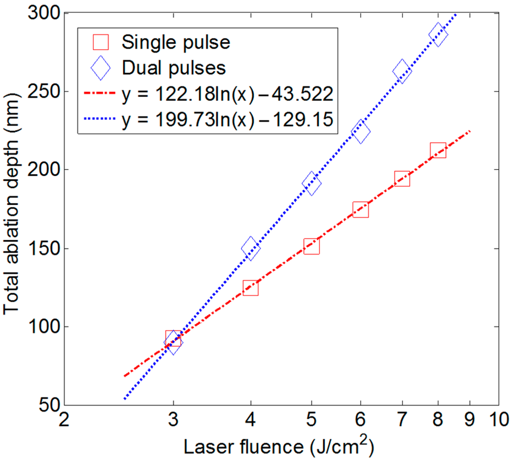 In the femtosecond laser material ablation process, it is desirable that the maximum ablation depth be obtained and that the temperature rise could be as low as possible to reduce the heat-affected zone and thermal stresses. Figure 4 shows the variation in the total ablation depth between the single and dual pulse for a total laser fluence of 3–8 J/cm2. The ablation depth by the dual pulses with a suitable tsep, i.e., tsep = 80, 85, 120, 145, 170 and 190 ps, is higher than that by the single pulse. The straight lines curve-fitted from the calculated data confirm the logarithmic dependence between the ablation depth and the laser fluence. The slope of the fitted line for the dual pulse is found to be higher by about 1.64 times, as compared to that for the single pulse. It is shown that the dual femtosecond pulses with suitable pulse separation time have a potential to increase material removal rates and thereby reducing the undesired thermal effects.