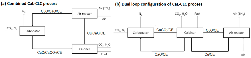 The stream obtained after the combustion of the fuel contains mainly CO2, possibly some unreacted alkanes from the fuel (e.g., natural gas), and steam that can be easily separated by condensation to produce a stream of CO2, which can be subsequently compressed and transported for storage [14]. The viability of various options of using CaL/CLC for post combustion CO2 capture has been investigated via process simulation [15]: Namely, integrated CaL/CLC using single CuO/CaO pellets (Figure 1a), and a dual-loop process with decoupled CuO and CaO pellets (Figure 1b). The simulation results showed that both configurations of CaL/CLC process had similar energy penalty reductions up to 40% as compared to just CaL process from the elimination of an air separation unit, but at the cost of increased solids circulation and process complexity. The dual-loop process required 10% to 20% less solids circulation to achieve similar energy efficiency as compared to the single-loop process. It is possible to offset the difference in the solids circulation between the two configurations if the carbonation capacity of the combined CaL/CLC is substantially improved which was part of the objective of this study.