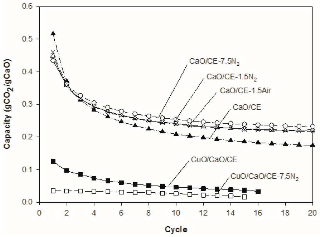 The CO2 capacity was higher in the first cycle for the untreated CaO/CE pellets than for CaO/CE pellets that were thermally treated (Figure 5). After three cycles, however, all thermally treated pellets had higher capacities, suggesting that the thermal treatment stabilized the pellets. At the end of 20 cycles, the capacity of the untreated CaO/CE pellets was 0.17 gCO2/gCaO which is less than 0.22 gCO2/gCaO for the pellets treated at 1.5 °C/min in either air or N2 and 0.23 gCO2/gCaO for the pellets heated at the higher rate of 7.5 °C/min in N2. The corresponding percent decreases in capacity over 20 cycles for these pellets were 65%, 53%, 51% and 46%, respectively. Since there were no noticeable differences in the results based on the use of air or N2 as a medium during the thermal pretreatment, it can be concluded that oxygen does not exert any significant effect on the state of the pellets.