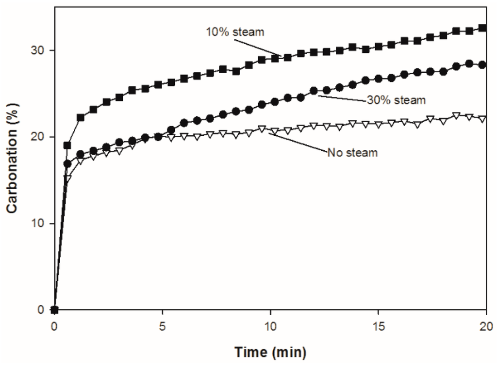 Figure 8 compares the carbonation of CuO/CaO/CE pellets in the first cycle with and without steam over 20 min. During carbonation, it has been suggested that there is a transition from kinetic to diffusion control, which is evident in the change in slope at approximately 1 min. The rates of carbonation are higher in the presence of steam, which supports the theory that steam enhances solid-state diffusion [19]. Unlike typical CaO based pellets which exhibited higher carbonation conversion with increasing steam concentration [19,25], the carbonation conversion of the CuO/CaO/CE pellets studied herein was higher with 10% steam than 30% steam (Figure 7b and Figure 8). This result could be due to side reactions catalyzed by the presence of Cu, which inhibit the carbonation of CaO.