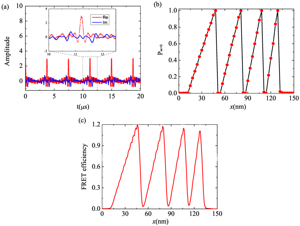 (Color online) (a) Complex RF pulse used to write a chirped grating. Red line with cross symbols is the real part while blue line without symbols is the imaginary part; (b) The spatial distribution of the probability that the spins are prepared in the bright state; (c) The Föster resonance energy transfer (FRET) efficiency on the substrate surface when the readout contrast is .