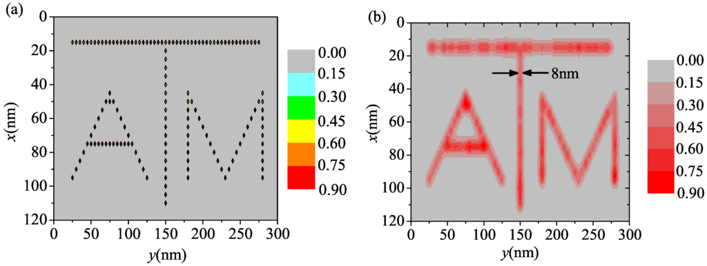 For a 2D pattern numerical example, we write the Texas A&M University logo (“ATM”) into a 120 nm × 300 nm region. This area is divided into 24 slices in the x direction and 60 slices in the y direction. The separation of the spins is chosen to be 5 nm on a square grid. The implantation of square grid of spin defects may be generated by electron holography lithography [] or nano-sphere lithography []. The pulse sequence is shown in Figure 1d where both X-gradient and Y-gradient magnetic fields are involved. In the numerical simulation, the gradients in both directions are generated by 100 mA currents using the same wire separation as in the 1D example. The narrow band microwave π pulse used to drive transitions is assumed to have a Gaussian time envelope. The time duration of the entire pulse A which selects a line is about 2.7 μs where the Gaussian envelope portion has a width of about 0.75 μs. The time duration of the complex pulse B is also about 2.7 μs which is discretized into 5000 time steps. The total time duration to write one line is about 10.8 μs and it is about 250 μs for the whole process. The dephasing time is assumed to be about 20 μs []. Again, the amplitudes of the pulses have a fluctuation of about . The probability that the spins are in the bright state () is shown in Figure 3a where we can see that the desired pattern is successfully encoded into the internal state of the system. Finally, an optical readout can transfer the pattern of the internal states to the photoresist. Assuming that the paramagnetic spins are about 5 nm deep with 1 nm uncertainty and the FRET radius is 5 nm, the relative FRET efficiency at the surface is shown in Figure 3b where we see that the desired pattern can be formed. The full width at half maximum of the line in the middle is about 8 nm.