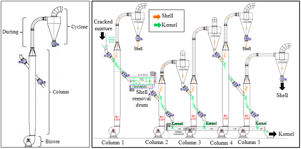The separation of shell and kernel in this system works on the principle of the specific gravity differential of the materials in the presence of a high velocity airflow caused by a blower powered by an electric motor. Each stage, as shown in Figure 1 (left), consists of a blower, a winnowing column, a ducting and a cyclone, whereby the separation occurs at each column but the separated material is not necessarily discharged. Circular ducting connects the upper end of the column to the cyclone.