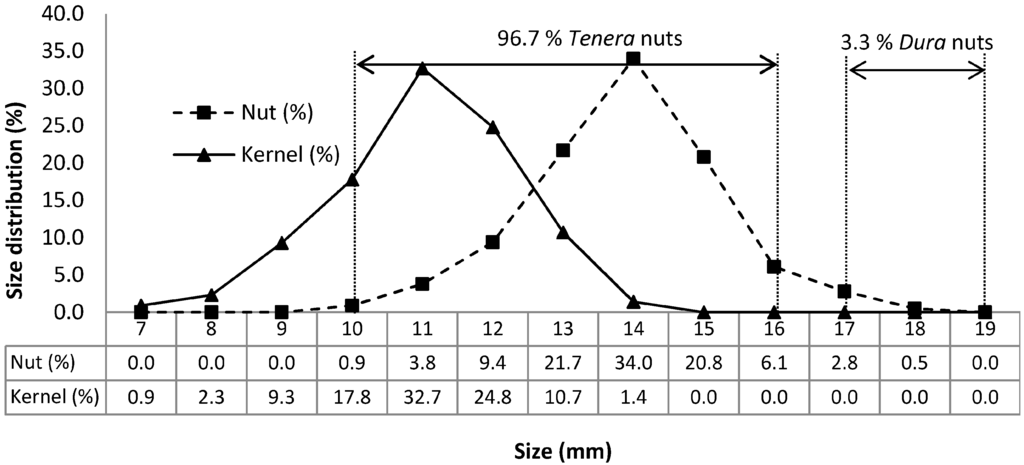 Measurement of nut and kernel size distribution prior to cracking was carried out to determine the exact composition of nut type processed in the mill, such as Dura, Pisifera and Tenera. Pisifera is a pollen-type nut, while Dura has a thicker shell and a lower oil content compared to Tenera, which is a hybrid between Pisifera and Dura. Tenera has a high oil content with a thin shell. Figure 5 shows nut size distribution prior to cracking and kernel size distribution after separation. It shows that Air Tawar POM processed about 96.7% Tenera nuts and 3.3% Dura nuts. Typical Tenera nuts may be 20 mm or less in length, and Dura nuts may be 20 to 30 mm in length. In terms of horizontal cross-sectional diameter, Tenera nut size is less than 16 mm, while Dura nuts are often more than 16 mm. The size distribution of nuts ranged from 10 to 18 mm in diameter; the largest nut sizes ranged from 13 to 16 mm with kernel sizes between 10 and 12 mm. Determination of the nut and kernel size distribution was important prior to optimization of kernel separation using the five-stage winnowing column system.