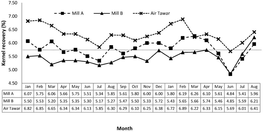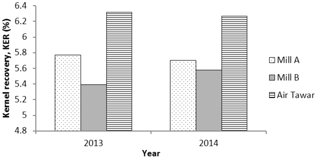On a yearly basis for two consecutive years, Air Tawar POM recorded the highest average KER of 6.32 wt % and 6.27 wt % compared to mill A (5.77 wt % and 5.70 wt %) and mill B (5.39 wt % and 5.58 wt %) (Figure 7).