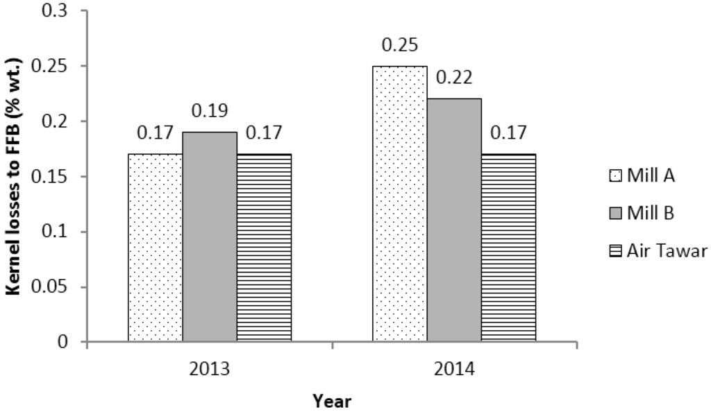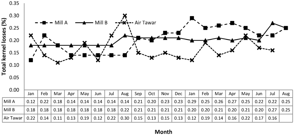 On a yearly basis for two consecutive years, Air Tawar POM recorded low average kernel losses of 0.17 wt % compared to mill A (0.17 and 0.25 wt %) and mill B (0.19 and 0.22 wt %), respectively (Figure 9).