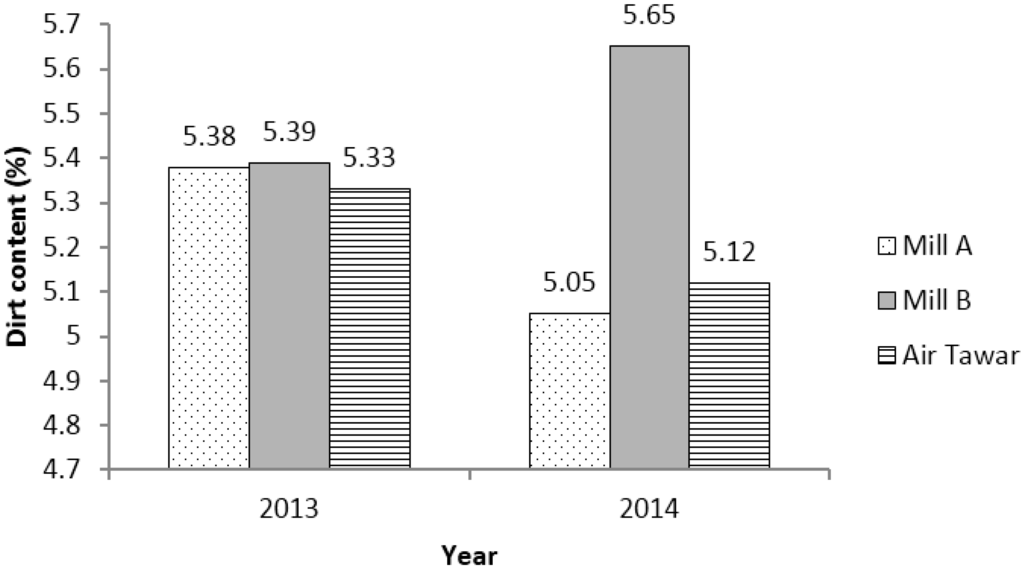 Over two successive years, the average dirt content in Air Tawar POM was 5.33 wt % and 5.12 wt %, whereas the dirt content in Mill A was 5.38 and 5.05 wt % and Mill B was 5.39 wt % and 5.65 wt % (Figure 11).
