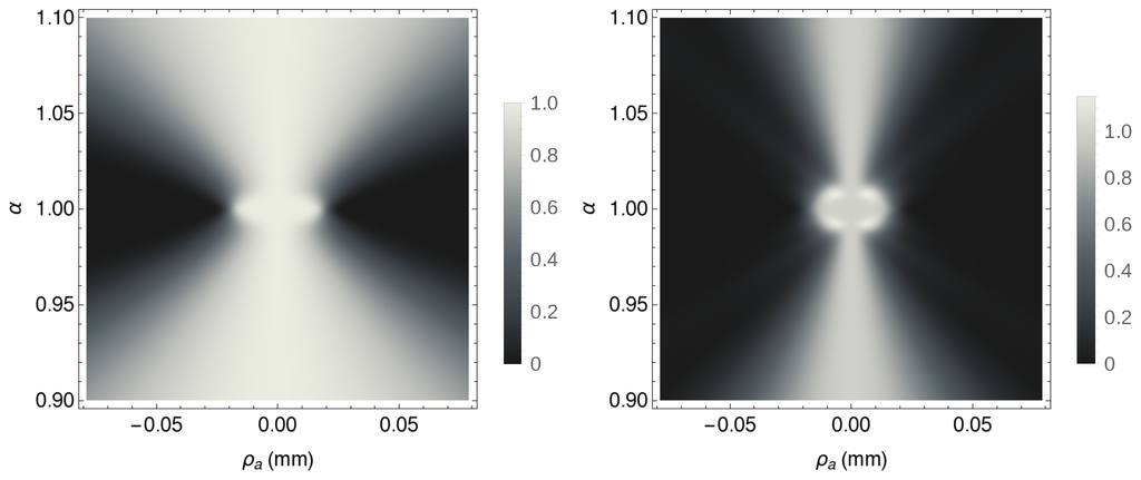 Now, to explicitly demonstrate this last point and better highlight the plenoptic properties of the second-order correlation function of Equation (10), we shall consider the more general out-of-focus situation () and rewrite it as a product of the pump profile and the object aperture function A with the phase factor , with: