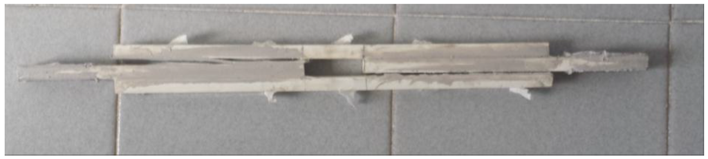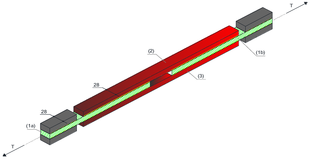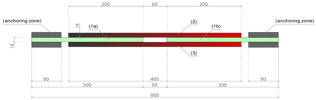 Four adherents can be identified: “1a”, “1b”, “2”, and “3”. The cross-section is identical for all of them (28 mm × 14 mm). Each adhesive layer is 1.95 mm thick and is made of an epoxy resin. The mechanical properties of GFRP and adhesive are summarized in Table 1 and Table 2.