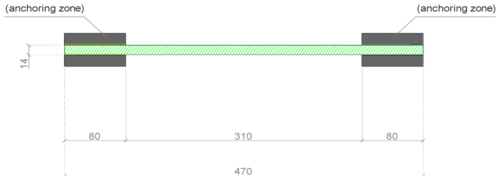 As a preliminary goal, two uniaxial tests have been performed on GFRP samples exhibiting the same cross-section as the adherents of the joint: 28 mm × 14 mm (Figure 3 and Figure 4).