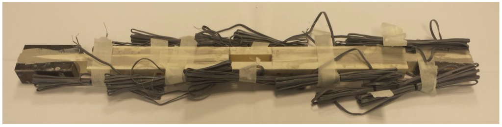 The strain gauge reliability was ensured by an appropriate choice of adhesive and by the presence of a protective gel. As shown in Figure 6, strain gauges have been applied to the external sides of adherents “2” and “3” at defined locations. Three different cross-sections were instrumented for any interface involved in the mechanical behavior of the joint (Figure 7 and Figure 8) Furthermore, four linear variable displacement transducers (LVDTs) were used to measure the global elongation of the joint. The experimental data were entirely acquired by means of a hardware/software system consisting of a data scanner connected to a personal computer. The scanner guarantees an automatic and modulated data acquisition, as well as a real-time adjustment of the data, due to the loss of the signal.