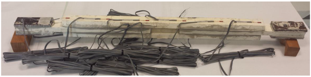 With reference to the main tests, the strain state evolution was measured by means of 12 uni-axial strain gauges with a grid size of 6.35 mm, characterized by a maximum strain capacity up to 3% and accuracy equal to 10−6 (Figure 6).