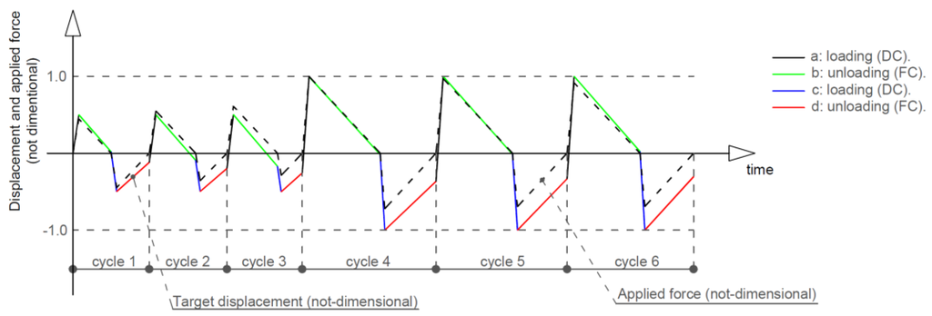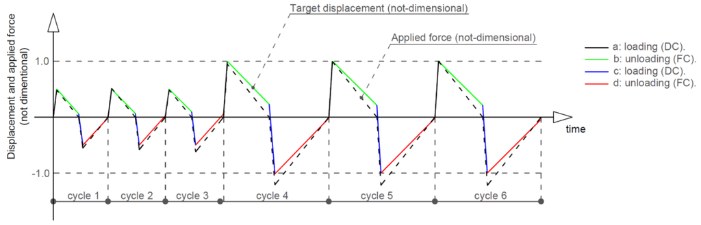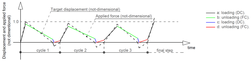 In order to compare experimental results to the numerical ones, the experimental response of the joint samples has been reproduced via a numeric simulation according to many simplifications. In particular, the loading steps are simplified compared to those given in Table 7 and Table 8 and are provided in Table 11.