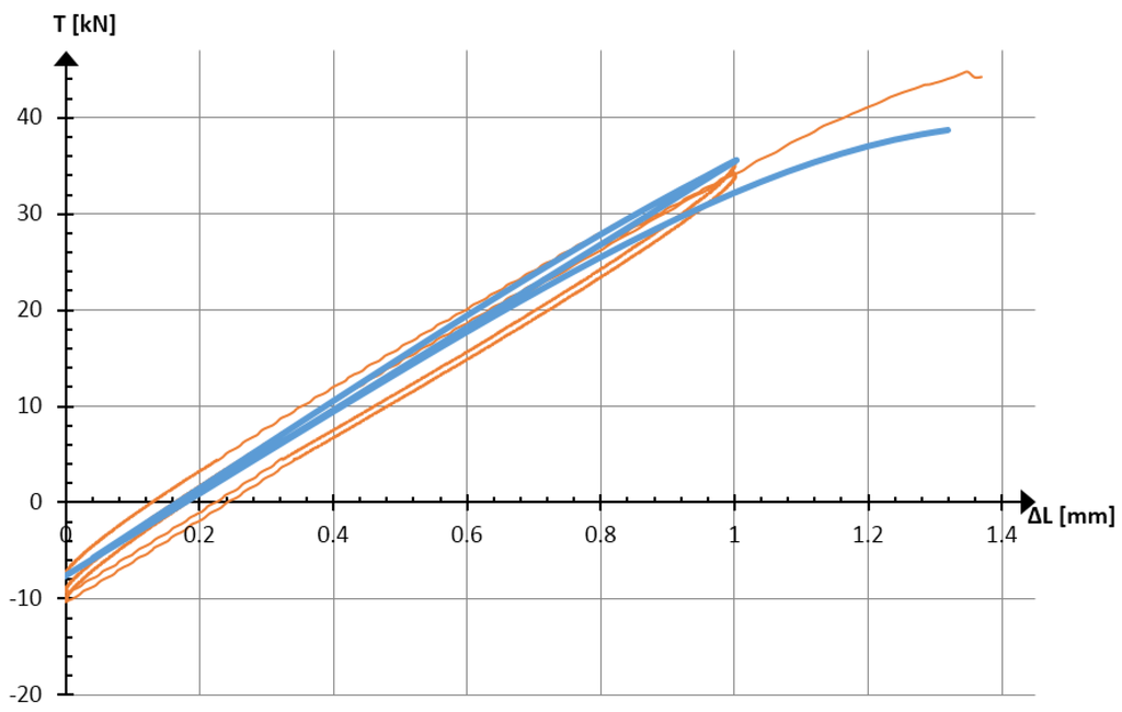 The blue curve for the numerical test, and the orange/red one for the experimental results, are close to each other. Moreover a similar hysteresis is observed. It is important that the theoretical model does not initially include a complete failure criterion; the failure is obtained only if the damage parameter is equal to infinity, and then it is not possible to reproduce the complete failure of the joint numerically. The model has been improved, introducing a complementary criterion (a large value of the damage parameter) in order to obtain the complete rupture of the interface.