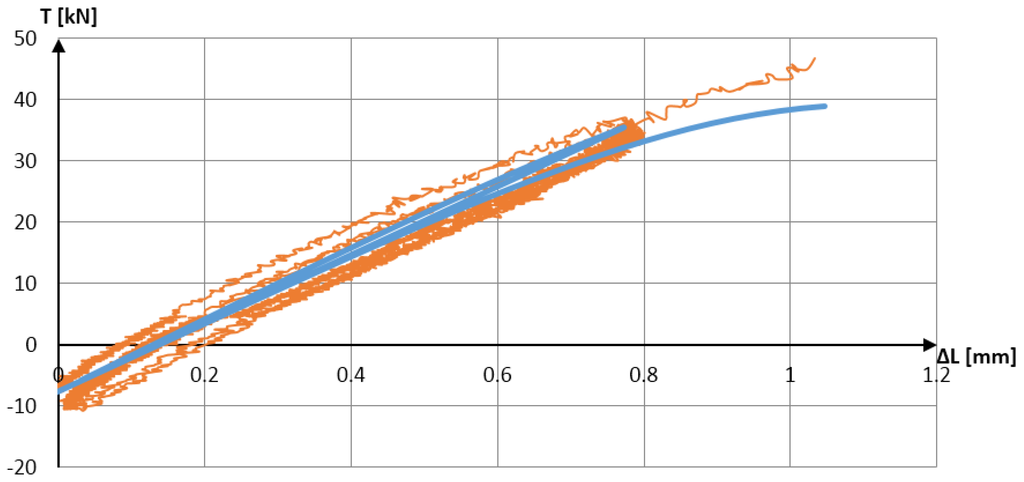 As for the GFRP samples, the generic step is identified by means of two points, denoted via the subscript “0” or “1”. The symbol “T” denotes the axial force while the symbol “∆L” is for the axial elongation of the joint, evaluated by means of the LVDT signals. It is important to remark that the current elongation of the joint is usually lower than the current target displacement, due to two circumstances: (i) the free elongation of the end of the sample, behind the adhesion zone; and (ii) possible sliding within the anchoring devices.