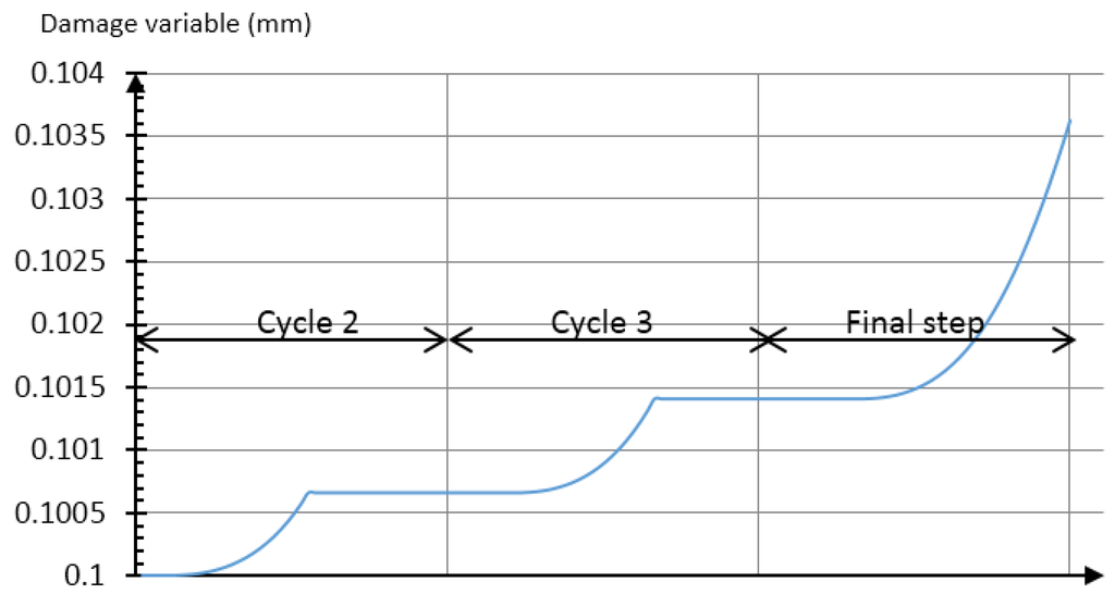 Evolution of the damage variable l [mm] over cycles “2”, “3”, and the final step.