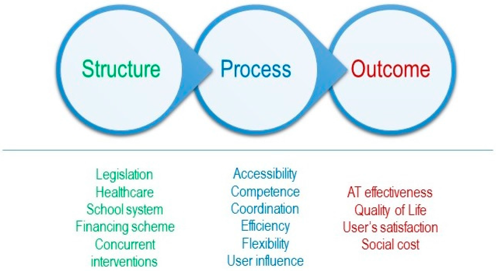 To this end, we recently developed a framework for AT service delivery quality assurance which may be used to include validated measures in AT practice. In detail, our framework was developed by combining the healthcare quality evaluation framework developed by Donabedian [] with the quality criteria set by the AAATE [] (see Figure 1). According to Donabedian, healthcare evaluation may be defined by distinguishing between structure, process, and outcome []. Structure refers to organizational factors that define the health system under which care is provided (e.g., health facilities, staff characteristics). Process refers to interactions between users and the healthcare structure [,] (e.g., diagnosis, treatment, referral, interpersonal communication). Outcome refers to the consequences of interaction between individuals and the healthcare system, related to structure and process [,]. Furthermore, in order to assess ATSD process quality, the AAATE identified six quality criteria [,,]: “Accessibility”, referring to information on ATSD-related service access (e.g., waiting times, ATSD process duration); “Competence”, referring to information on professionals’ AT-related know-how (e.g., education of the professionals involved in the ATSD process, AT training offered); “Coordination”, referring to information on AT-related service integration (e.g., contact between the professionals involved in the ATSD process); “Efficiency”, referring to information on control of the ATSD process (e.g., complexity of procedures, availability of mechanisms able to control costs and process effectiveness); “Flexibility”, referring to information on ATSD-related service ability to respond to different user needs (e.g., use of a multidisciplinary approach); and “User Influence”, referring to information on user involvement (e.g., user presence at any stage of the ATSD process). Taken together, these contributions provide AT professionals with a common frame of reference in organizing an ATSD quality assurance process.