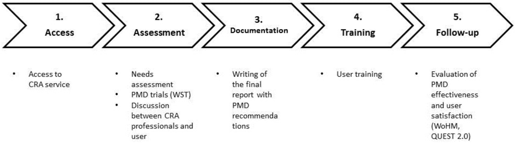 A detailed description of the AT service delivery process in Italy is provided in Appendix A. The studies here described were conducted at the Regional AT Center (Centro Regionale Ausili, CRA) in Bologna (Italy), which is the center of reference for technical assessment, information, advice, training, and research on AT, established in 2000 by the Departments of Health and Social Policy of the Emilia Romagna Regional Council. The CRA serves as a support service for the health professionals working in the Emilia Romagna region. Its main scope is to promote the autonomy of people with disability by giving them and their significant others (e.g., families, health professionals) advice on AT solutions in the following areas: mobility and seating, transfers and lifting, personal care, home adaptations, accessibility, and technologies supporting interaction with the environment, sports and leisure. The CRA provides multidisciplinary consultation, especially in complex cases where intervention is requested by the individual’s health service provider.