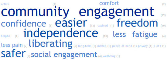 Comments provided by people using AT reflects the transformative impact of AT on their lives. Even the brief descriptions of social and community engagement suggested the value people placed on engaging with loved ones and other community members; accessing community facilities, events and attractions; and the resulting health and well-being that resulted from the relationships and encounters experienced. The freedom and liberation afforded by AT, allowing people to engage in mainstream activities, released people from arduous arrangements and transformed their outlook. The independence and ease of performing tasks not only reduced reliance on others and demand on carers, it also increased the range of activities that people could engage in and the viability of carers providing ongoing support. AT was also identified as improving safety, confidence and reducing fatigue and pain, which then increased motivation to become more active. The results of this study echo findings of other qualitative inquiries that have highlighted the personal outcomes valued by AT users [10,14,31].