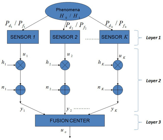 For WSNs with limited resources, the effect due to channel fading and noise renders the information received at the FC not completely reliable. Corruption on the received local decisions will lead to performance loss if they are not properly considered. The traditional three-layer parallel WSN system model can be described in detail as follows.