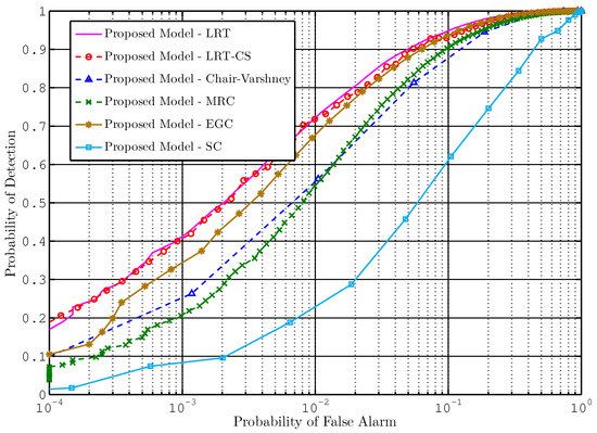 28]. Namely, the likelihood ratio test (LRT), equal gain combiner (EGC), maximum ratio combiner (MRC), Chair–Varshney and the likelihood ratio test based on channel statistics (LRT-CS). In addition, the so-called selection combining will also be investigated as a fusion rule.