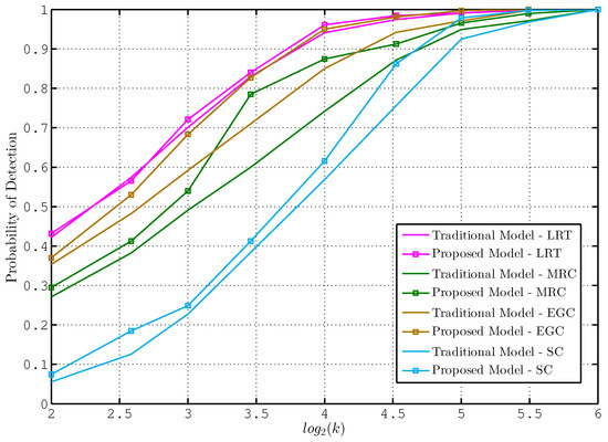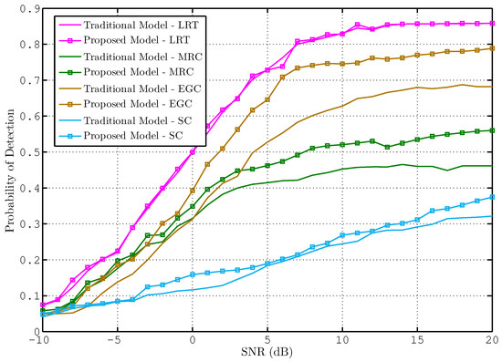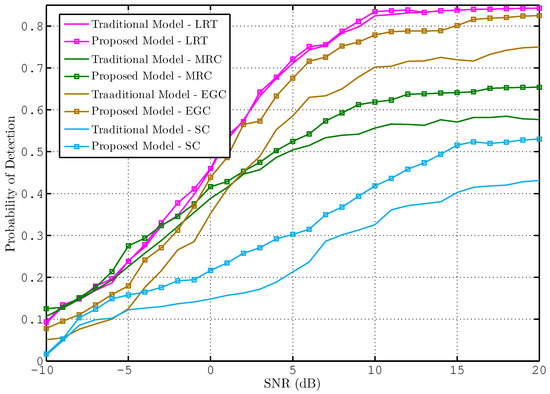 Figure 4, one can notice that the performance of the proposed model is better than that of the traditional model for the various fusion rules and for a wide range of channel SNR. While the LRT shows the best performance among the other fusion rules in both models, the EGC fusion rule applied at the proposed model provides a performance very similar to that of LRT-CS for a wide range of SNRs and better performance than other fusion rules such as MRC and Chair–Varshney fusion rules. Thus, applying the LRT at the sensors level and EGC at the FC can significantly raise the performance of the proposed model when compared to the traditional model. Moreover,