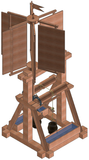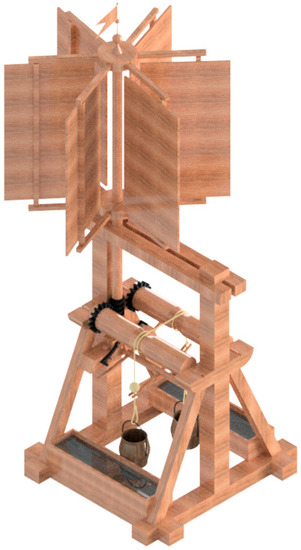 The functioning of the machine was divided into two parts; the rotor mechanism and the elevating mechanism. The rotor mechanism was composed of the vanes, the vane guide, and the main axle ending in a worm screw in its lower part. Thus when the wind strikes the vanes (panels of wood), these do not follow a joint reaction with the main axle, as they can turn on an eccentric axis with respect to the main one because of their guides. This allows the vanes to oppose the wind direction only on one side of the mechanism, encouraging the turning, as reflected in