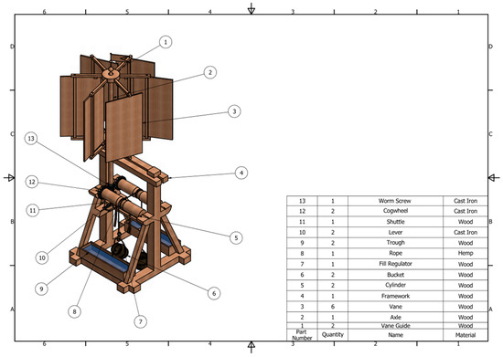 10], it appears in manuscript 1487, the digitalization of which was provided by the National School of Bridges and Roads of the ParisTech (Paris Institute of Technology). In this report, only two drawings (plans) appear. On the first sheet, appears two dihedral projections of the invention (elevation and lateral view), together with an oblique perspective; and, in the second one, an upper projection (top view) of the rotation system and an oblique perspective of the regulator system for filling the troughs.