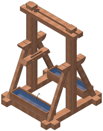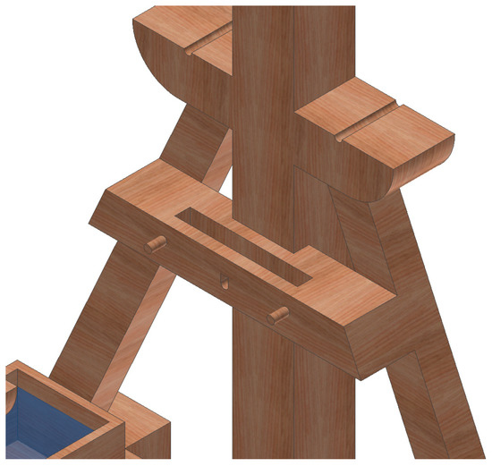 Figure 7 presents the detail of another element of the framework, which is the cross member coupled to the post closest to the vertical axle with a slot cut in its upper part. This member is the guide for the wooden shuttle, which will be mentioned below and which enables the horizontal movement of the vertical axle. Finally, in the part where the struts come together at an angle with the posts, appear two wooden supports for the two cylinders that end in the two cogwheels that convert the horizontal movement into vertical movement. These elements were modeled together with the frame that supports the entire structure, since they do receive stresses from different elements, including those from the upper structure as well as those generated in the process of loading the water in the buckets.
