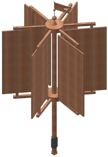 Figure 9), these elements being modeled independently of one another. The vertical axle moves with the guides, as these are inserted into a square hole and fixed. Meanwhile the vanes are free to revolve over the dowels regardless of the position of the vertical axis.