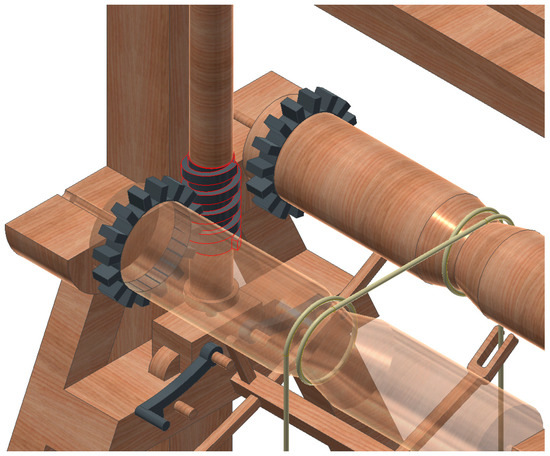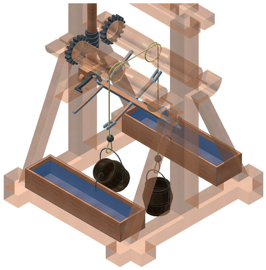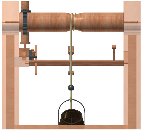 For the elevating mechanism, the turning of the axle and its worm screw activates two cogwheels connected to horizontal cylinders with a channel in the middle. By turning, with a rope looped around each of them in the channel, the cylinders raise one end of the rope and lower the other end, thereby raising and lowering two buckets tied to either end of the rope in order to collect water (