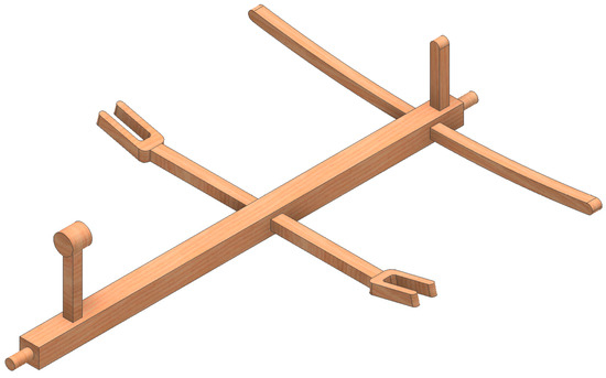 Figure 13). This axle has a square section and is supported horizontally by a dowel in each end for rotation and has several elements with functions that act in concert. First, on the left end, an inverted pendulum facilitates the rocking movement in one direction or the other. Second two forked clips extend from the central area, on the right end are two curved bars, and a small hammer is placed in the axle. In addition, the ensemble of the regulating axle was modeled in a single piece of wood although it would have to be manufactured in several pieces or some of the elements would need to be replaced.
