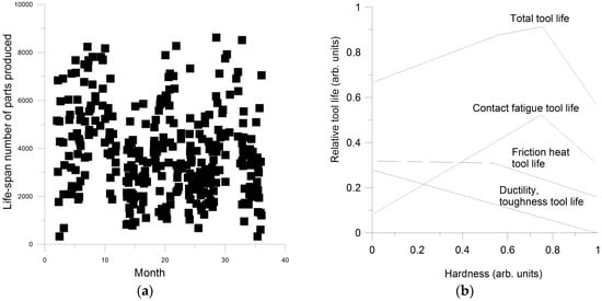Tool life, (a) data of life spans of individual tool inserts over time illustrating the large variation observed under industrial practice conditions, after ref. [5]; (b) schematic relation between toll hardness and reasons for failure in tooling after ref. [6].