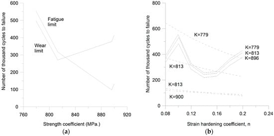 (a) Simulated fatigue and wear life versus strength coefficient after ref. [16]; (b) Simulated fatigue life for four different strengths coefficients versus the strain hardening coefficient after ref. [16]. Dashed line = fatigue limit, solid line = wear limit.