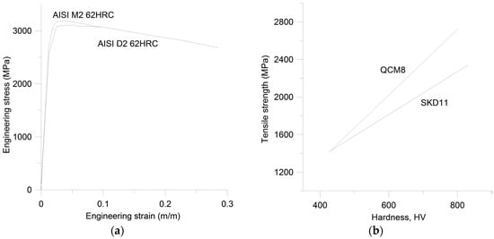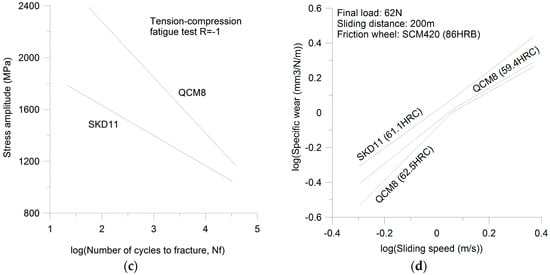 (a) Stress strain curves for M2 and D2 tool steels after ref. [2]; (b) Relation between hardness and tensile strength for SKD11 (D2-type) and QCM8 (low Cr version of SKD11) after ref. [18]; (c) Relation between stress amplitude and fatigue life for tension-compression fatigue for SKD11 (D2-type) and QCM8 (low Cr version of SKD11) after ref. [18]; (d) Relation between sliding speed and wear rate for SKD11 (D2-type) and QCM8 (low Cr version of SKD11) after ref. [18].