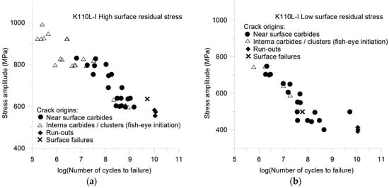 The material fatigue resistance is clearly influenced by the type and nature of the particles inside the material and as well as particle near the surface of the specimen and by the surface roughness. The individual influence and the origin of failure strongly depend on the stress level and number of cycles to failure as different crack initiation mechanisms are active. Sohar et al. [20] clearly illustrated this experimentally for a high chromium alloyed tool steel in giga-cycle fatigue, Figure 8a,b. The influence of carbides and the effect of surface residual stresses, resulting from heat treatment or from the grinding/polishing process, on the fatigue behavior in the giga-cycle regime of ingot metallurgy produced D2 type tool steel were examined. Residual stresses were found to be responsible for the occurrence of two failure modes: