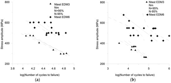 (a) Fatigue data of ultrasonic high cycle fatigue tests for AISI D2 steel K110L-I with high surface residual stress after ref. [20]; (b) Fatigue data of ultrasonic high cycle fatigue tests for AISI D2 steel K110L-I with low surface residual stress after ref. [20].