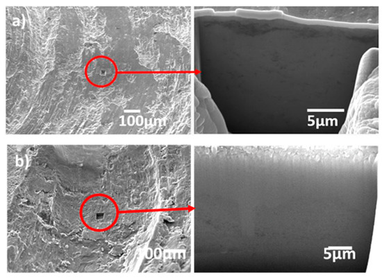 FIB image of trench on the wear track and subsurface of Al-2 vol % GNP after (a) RT Test and (b) 200 °C Test.