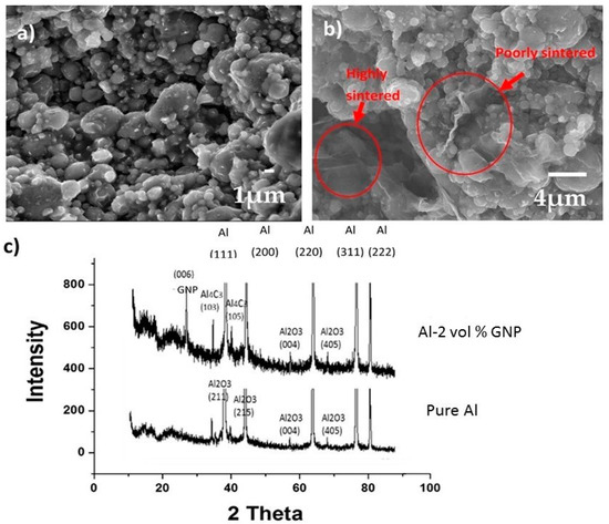SEM images of the fractured structure of sintered Al and Al-2 vol % GNP pellets are shown in Figure 3a,b, respectively. Figure 3a shows aluminum spherical particles with a moderate level of densification. Figure 3b shows an agglomerated GNP stringer surrounded by poorly sintered aluminum particles. The GNPs are wrinkled and agglomerated. The density of the pure Al sample was 96%, whereas Al-2 vol % GNP had a poor density of 91% due to the agglomeration of GNPs. The microhardness of a sintered Al pellet is 59 HV, which marginally reduces to 55 HV for Al-2 vol % GNP. It has been known that GNPs tend to agglomerate and restack, allowing the formation of porosity [12]. X-ray diffraction of sintered pellets was carried out to observe if any new phase(s) were formed during sintering. All major peaks representing pure Al are located at 2θ equals to 38.74°, 44.96°, 65.29°, 78.29°, and 82.81° in both samples. Pure Al also shows trace amounts of Al2O3 formation. The Al-2 vol % GNP sample resulted in the formation of trace amount of Al2O3 and Al4C3 phases. In addition, the main peak representing the retention of carbon-based material can be observed for the (006) plane.