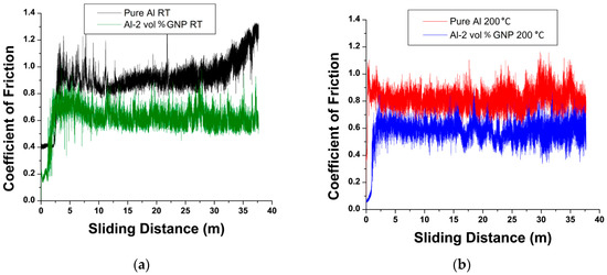 Coefficient of friction (COF) for pure Al and Al-2 vol % GNP at (a) RT and (b) 200 °C.