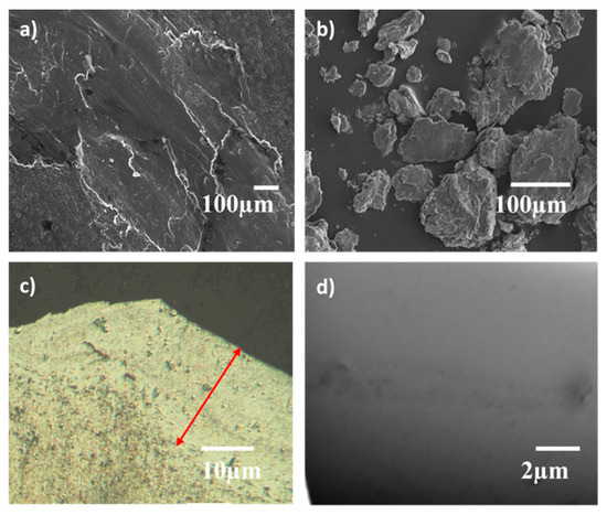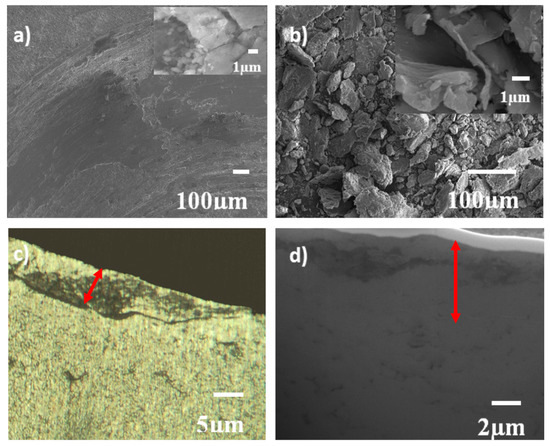 A common type of wear in pure Al is adhesive wear [24,25], which occurs when two surfaces are initially rubbed against each other. However, due to localized heating and oxygen diffusion, the surface forms an Al2O3 layer, which is brittle in nature and undergoes abrasive wear. It is expected that the hard and brittle Al2O3 phase will generate large particles of wear debris, thus increasing wear rate and the COF. Figure 7a shows the wear track of pure Al, which is very rough and presents the formation of cracks. The surface of the wear track reveals crack formation and the EDS shows a high amount (31.4 wt %) of oxygen. The brittle Al2O3 surface layer generates a large amount of wear debris (Figure 7b). These wear debris present an average bimodal size distribution of 20 µm and 60 µm. These big detachments reveal adhesive wear for pure Al [25,26], whereas finer debris is indicative of a mixed nature due to presence of brittle Al2O3. Adhesive wear also results in the formation of a tribofilm on the wear surface. The thickness of the tribofilm is in a range of 5–8 µm, as indicated by the red arrow.