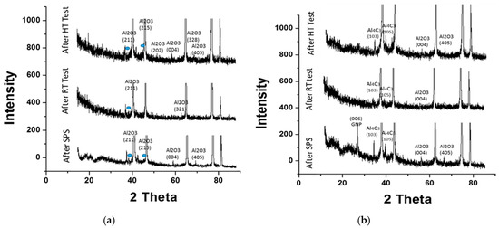 XRD after SPS, RT Test and HT Test for (a) Pure Al, (b) Al-2 vol % GNP.