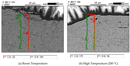 Cross sectional SEM image and Energy Dispersive Spectroscopy (EDS) analysis showing carbon and oxygen distribution below the wear track of Al-2 vol % GNP sample: (a) RT and (b) 200 °C.