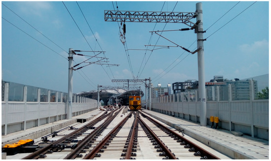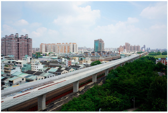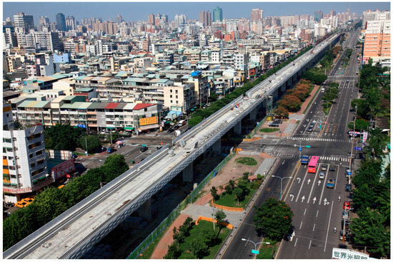 To effectively use urban land and address various urban transport problems, in recent years the government of Taiwan has been promoting the use of elevated railway systems in urban areas, as shown in Figure 1. Since most urban railways are located adjacent to densely-populated residential and commercial areas, noise and vibration reduction becomes an important issue after the commencement of railway viaduct operation. Laying ballastless track has become a basic need in railway viaduct projects due to the importance of train noise reduction, improvement of passenger comfort, and the need to minimize the track maintenance costs.