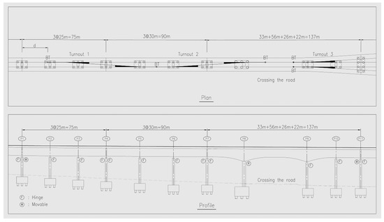 In addition, the relative displacement of a bridge expansion joint can cause track displacement or turnout damage, so the bridge expansion joint with turnout switch blades must be kept at a certain distance (denoted as “d” in Table 1 below). The d values are recommended in Table 1, in which L indicates the expansion length of the bridge [1].