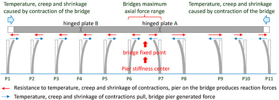 For hinged plates, temperature change on a hinged slab has the most significant axial force effects, followed by creep and shrinkage (maximum axial forces caused in about 3000 days after the bridge construction was completed). The influences of temperature, creep, and shrinkage on the overall bridge structure are indicated in Figure 4. Figure 4 shows that the range of maximum axial force is close to pier stiffness center or the bridge fixed point position. Hinged plate A is located in the range of maximum axial force. It should be designed to adopt the maximum axial force. According to analysis results, the axial forces of hinged plate B are significantly smaller.