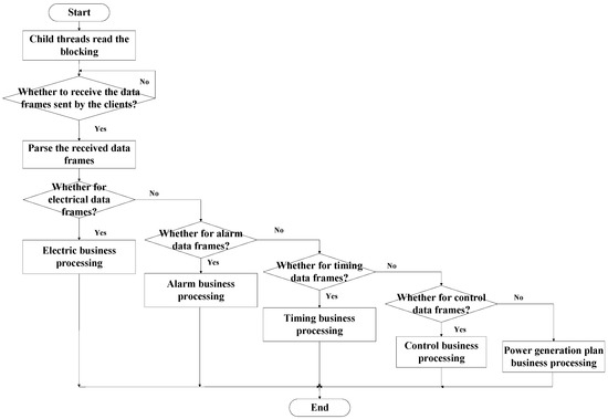 The SCADA system invokes the “start” method of Thread class to start the thread. The “start” method invocation will invoke asynchronously the “run” method of this Thread class, and the business processing is in the “run” method. The system receives the Modbus/TCP protocol data frames by the IO stream in the “run” method. After the data frames have been parsed and verified, they are classified according to the control code field in the protocol data frames. The data are processed in five different ways according to the results of the classification: Electrical message business processing, alarm message business processing, message business processing of clients requesting the system to check the time, message business processing of the upper monitoring system sending control instructions, and message business processing of upper monitoring system giving the power generation plan instructions. Finally the processed data are inserted into the corresponding MySQL database tables, which are displayed in the web pages in the WEB monitoring system, so that the administrator can handle the event. The business processing flow of the SCADA system is shown in Figure 2.